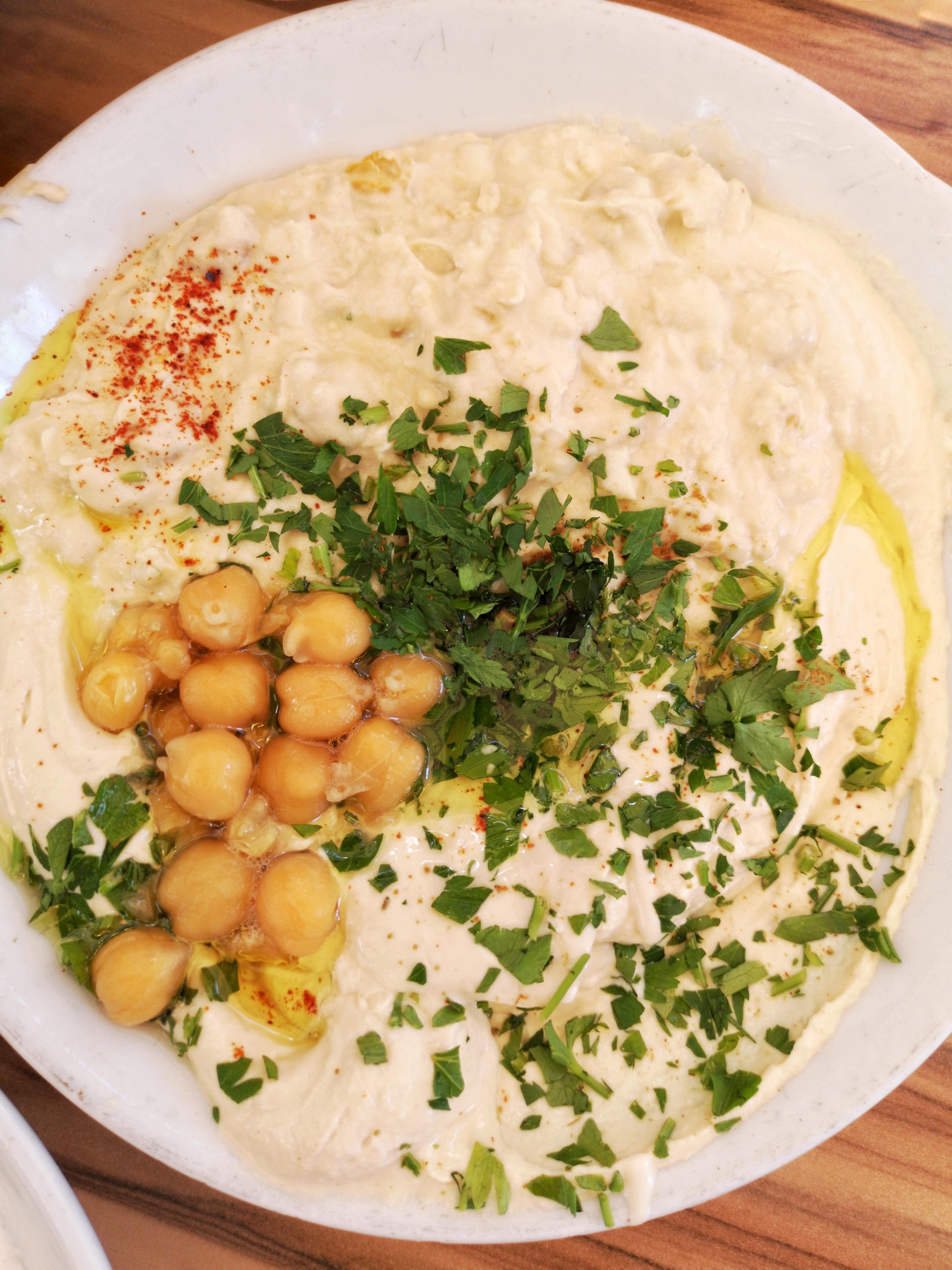 Cea mai frumoasă amintire culinară pe care o avem din Israel este micul dejun luat la Abu Hassan. Aici am gustat un hummus foarte cremos și perfect echilibrat (de regulă, hummusurile pe care le mâncasem înainte erau fie prea bogate în tahina, fie aveau prea multă zeamă de lămâie). La sugestia băiatului care ne-a servit, am luat, pe lângă hummusul minune, și o porție de musabahha (un fel de hummus făcut cu boabe de năut întregi) și labneh. Experiența a fost completată de o ceapă, sos picant din partea casei și niște pita de întins în hummus.