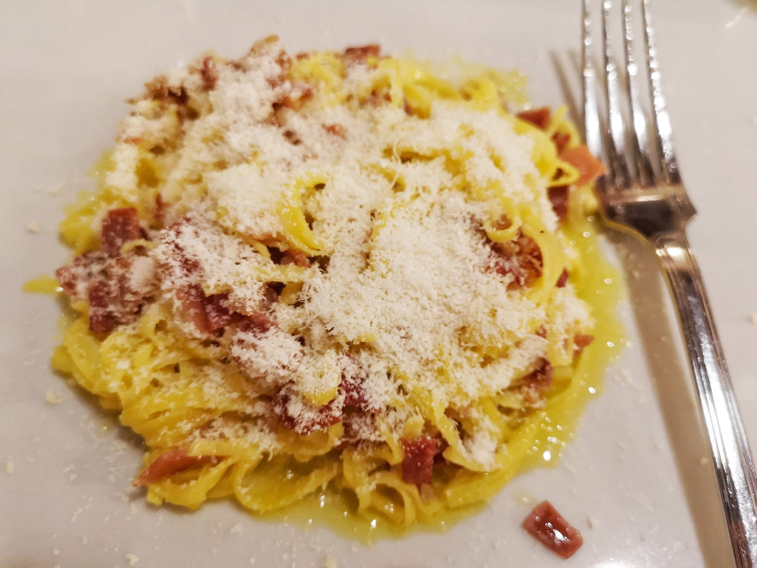 Vi s-a întâmplat vreodată să vă aflați într-un city break și să mergeți vreo 30 de minute în afara zonei turistice doar pentru a ajunge la un restaurant? Nouă da. Cam tot timpul. Așa am ajuns la Da Cesare al Casaletto din Roma, un restaurant de cartier plin de italieni ieșiți la masa de duminică în familie. Ne-au plăcut aperitivele – trebuie să menționăm gnochetti fritti în sos de cacio e pepe, paste mici, din cartof, prăjite, și servite pe sos făcut din brânză Pecorino Romano și piper – și mai ales spaghetti carbonara, mult mai cremoase decât orice alte carbonara încercasem până atunci. Am scris mai multe despre Da Cesare aici.