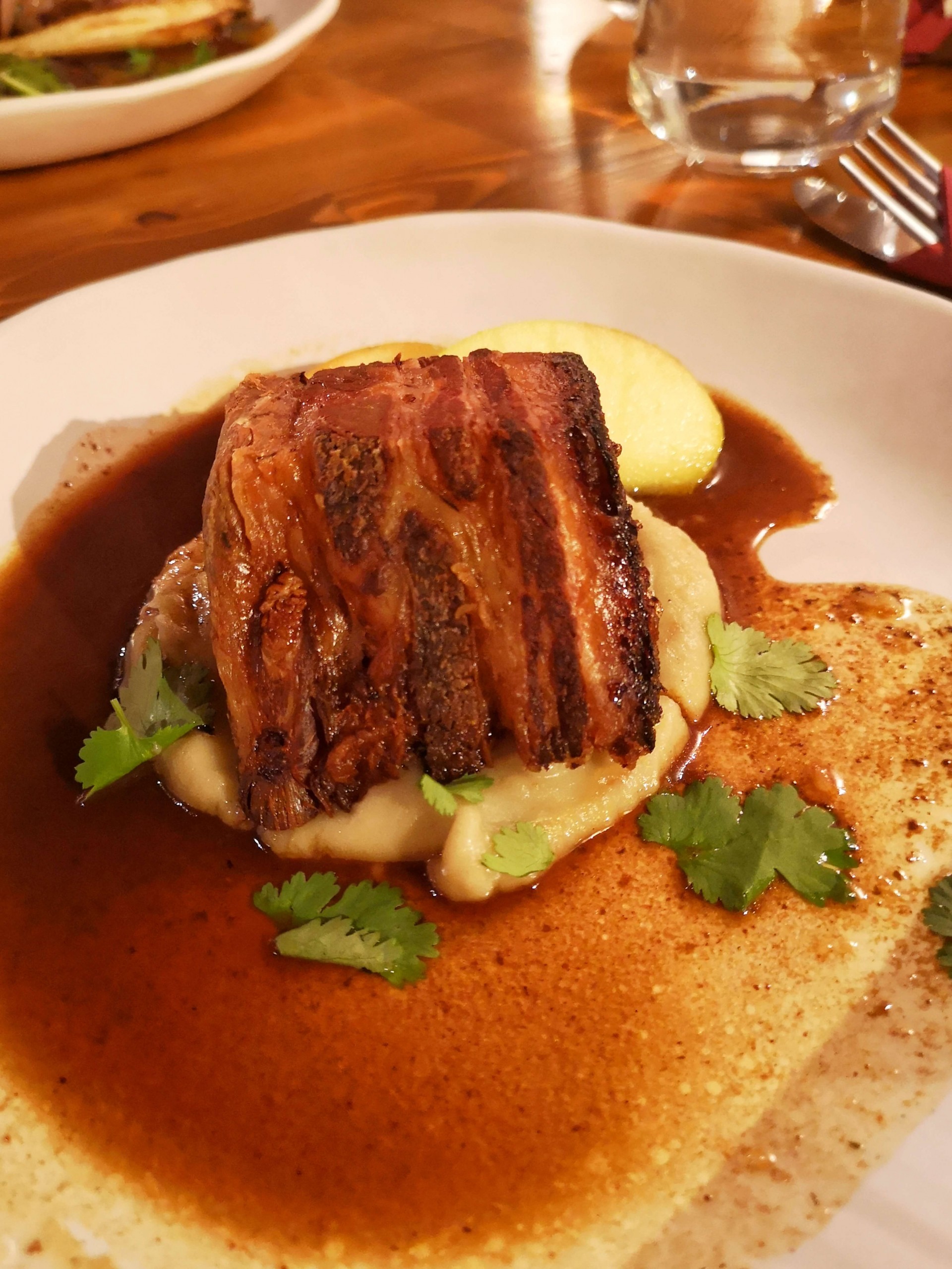 Chiar dacă îl știam pe Ioan Bebeșelea de câțiva ani, de-abia în 2019 am ajuns să călcăm pragul restaurantului său din Sibiu. Și tare bine am mâncat! Syndicat Gourmet este, în mare parte, despre bucătărie românească modernă și despre ingrediente locale și de sezon, dar am găsit și câteva preparate cu influențe indiene în meniu. Cotletul de noatin (miel de până în doi ani) din Valea Hârtibaciului, cu salată picantă, rădăcinoase la cuptor și sos de miel merită un drum special până la Sibiu. Am mai recomanda și sloiul de oaie sau fleica de porc cu piure de topinambur, dar dacă ajungeți pe-acolo în grup mare, încercați cât mai multe preparate din meniu – toate-s foarte bune.